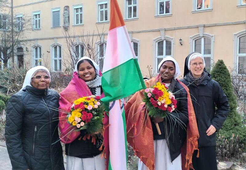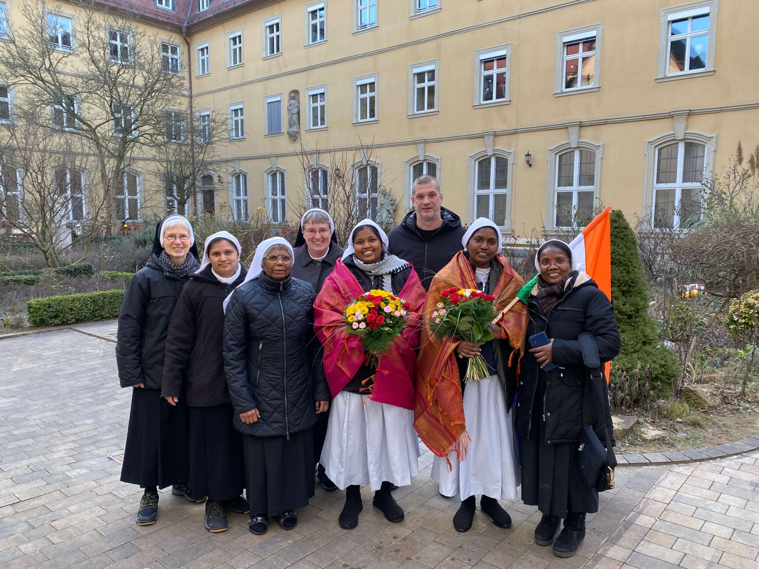 Mit großer Herzlichkeit und Freude nahmen wir am Donnerstagnachmittag, 22. Januar 2026, unsere beiden neuen indischen Mitschwestern, Sr. Gracy und Sr. Himandi, in unserem Garten in Empfang. Bei winterlichen Temperaturen in Deutschland/Würzburg hatten die beiden einen Temperaturunterschied von mehr als 30 Grad zu verkraften, dazu die Zeitumstellung, der lange Flug und die Umstellung auf ein neues Land und völlig neue Kultur. Aber dennoch begegneten sie uns mit einer herzlichen Offenheit und Freundlichkeit, sodass es für beide Seiten eine schöne erste Begegnung war. Wie in Indien zur Begrüßung üblich, wurde den beiden Schwestern jeweils ein Schal umgelegt und natürlich erhielten sie einen Blumenstrauß.